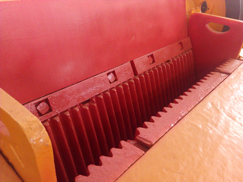 顎式破碎機的工作部分是兩塊顎板,一是固定顎板(定顎),垂直(或上端略外傾)固定在機體前壁上,另一是活動顎板(動顎),位置傾斜,與固定顎板形成上大下小的破碎腔(工作腔)。活動顎板對著固定顎板做周期性的往復運動,時而分開,時而靠近。分開時,物料進入破碎腔,成品從下部卸出;靠近時,使裝在兩塊顎板之間的物料受到擠壓,彎折和劈裂作用而破碎。